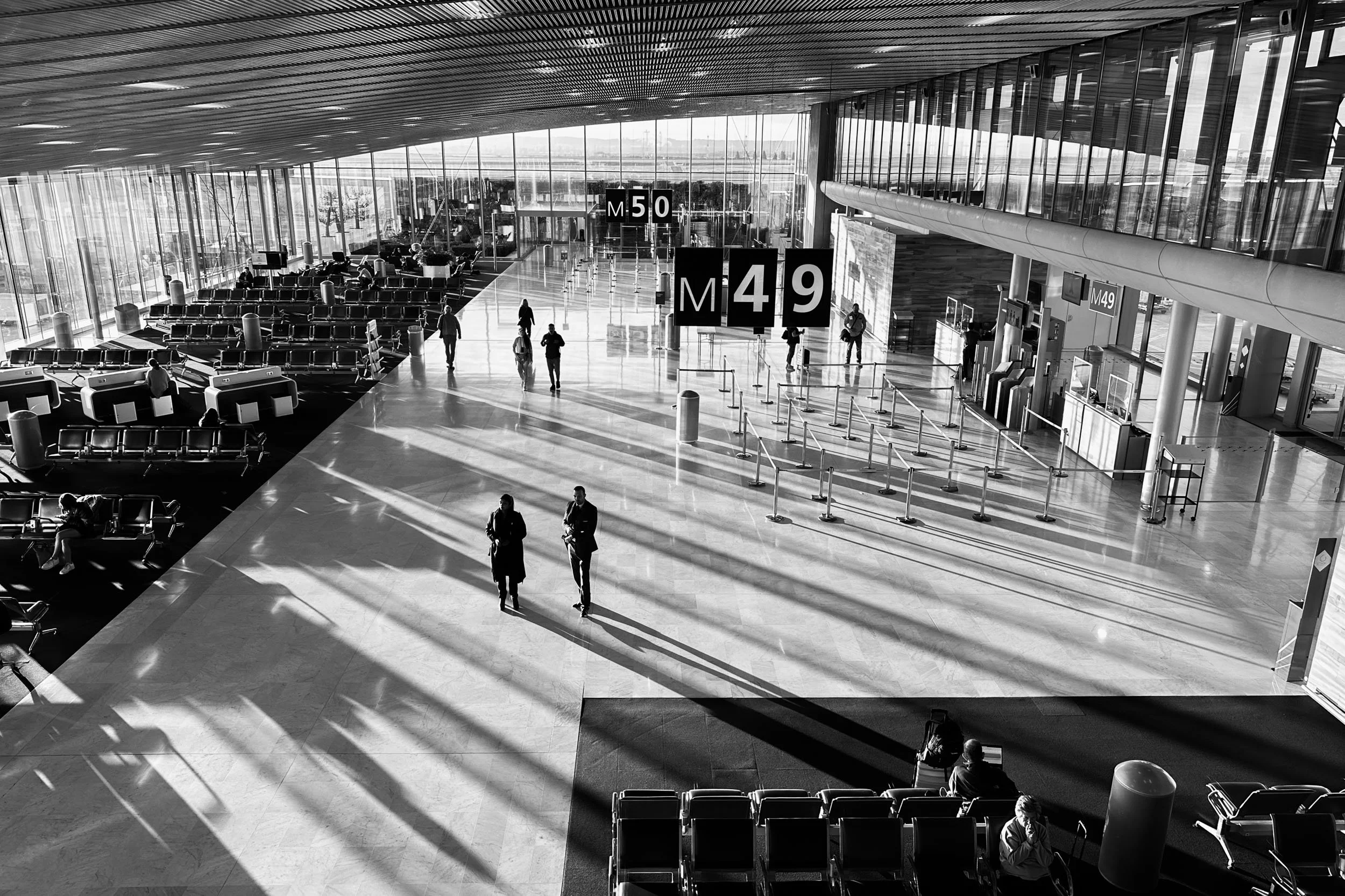 On a November morning in 2022, passing through Charles de Gaulle on a connection to South Africa, I stopped on the way to passport control and took a photograph on my phone, the only camera I had accessible at the time. The low morning sun was cutting through the terminal windows at a shallow angle, casting diagonal shadows across the windows and columns that turned the whole space into a grid of competing geometry. Most people move through CDG with their heads down, thinking about gates and boarding passes. I couldn't help myself.