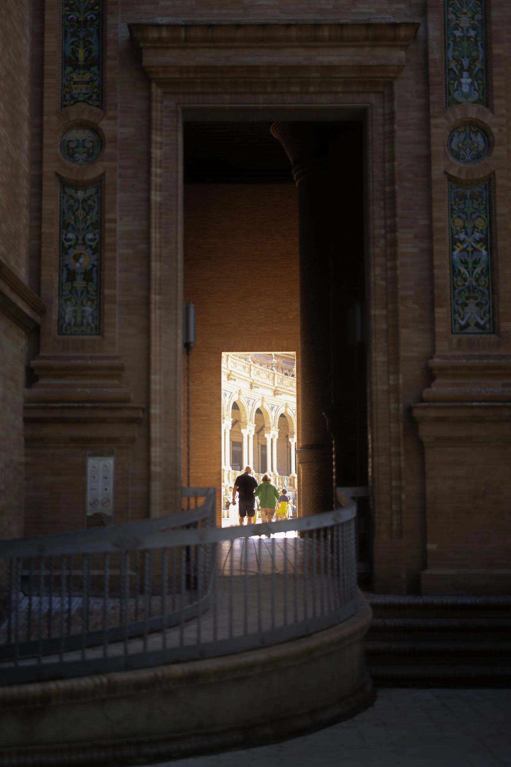 Walking on the streets of Seville in May 2023, I passed an ornate archway cast in shadow with warm sunlight coming through the opening. It stopped me there on the sidewalk. A curved walkway swept into the frame from the lower left, and two people were moving up the ramp toward the door, the arch framing them against the light beyond. There wasn't time to set up the shot. I stopped, framed, and captured it before they were gone.