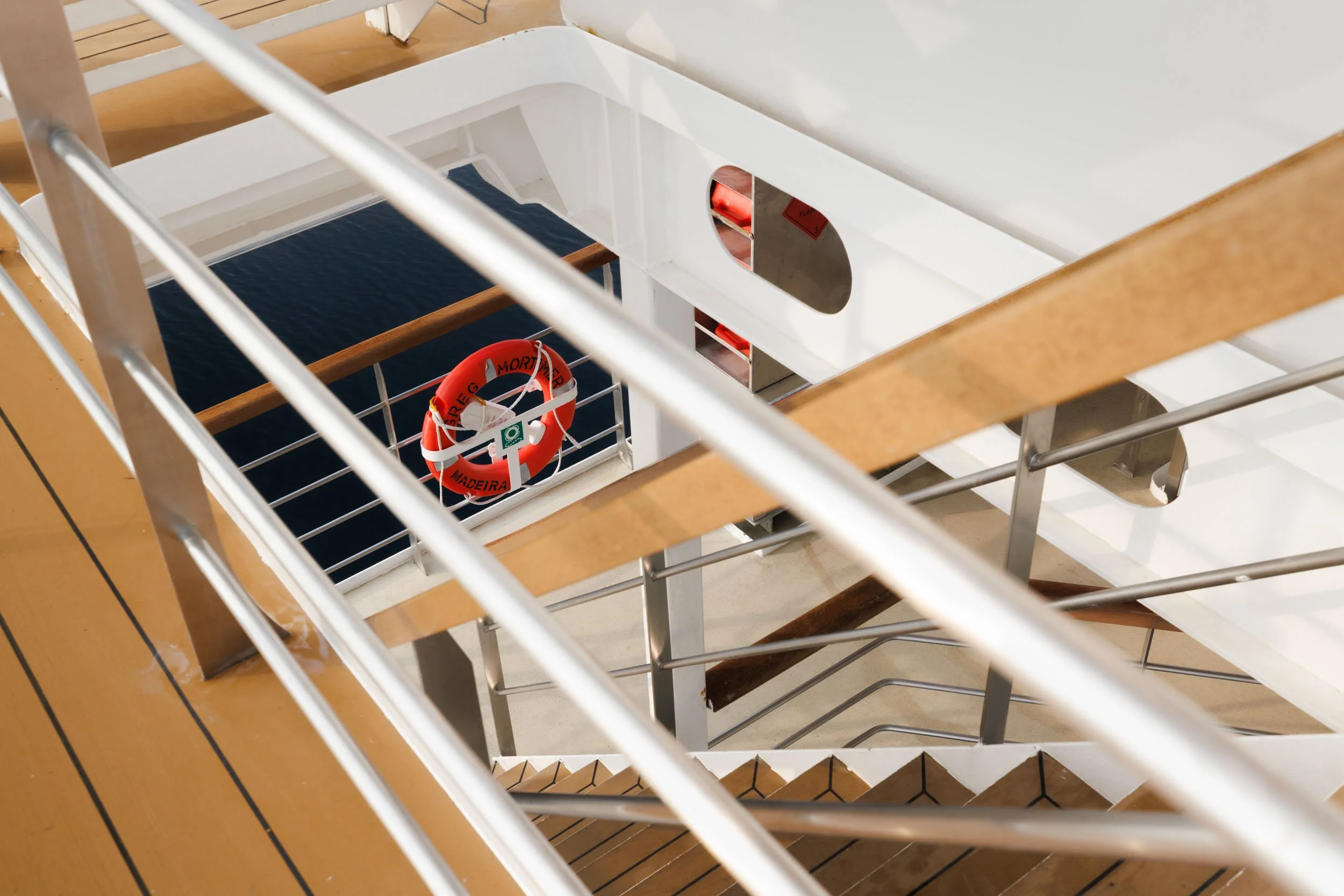 Between expedition landings aboard the Greg Mortimer in Svalbard in August 2024, with no wildlife in sight and nothing obvious to shoot, I turned the camera on the ship itself. The rails and staircase of the outer deck resolved into a composition of stacked diagonals, lines running parallel and crossing, with a single life ring sitting at the center of the frame.