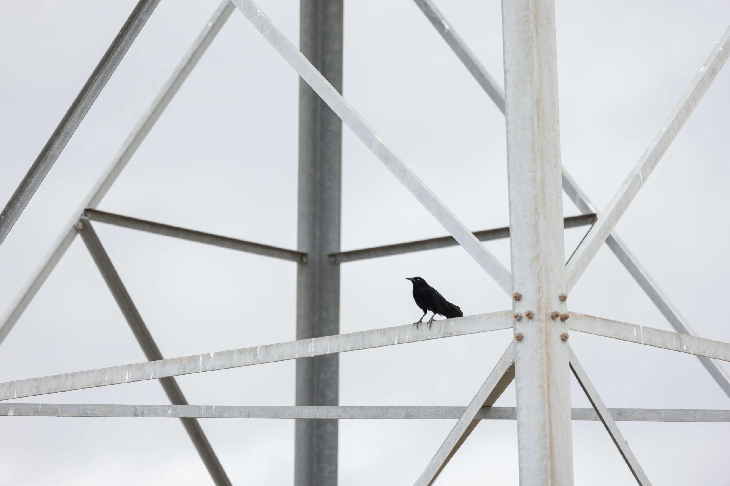 The geometry in that tower isn't incidental to the image. It's structural, in both senses. The rigid, angular, man-made lines of the cross-bracing meet the organic shape of the bird, and the contrast between those two things is where the visual interest lives. The geometry frames the subject; the subject animates the geometry. The crow perched on clean steel isn't just a bird in a frame; it's a juxtaposition, and the juxtaposition is the story. Neither element works as well on its own.